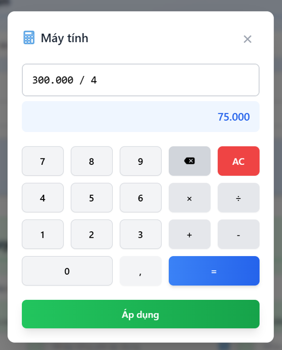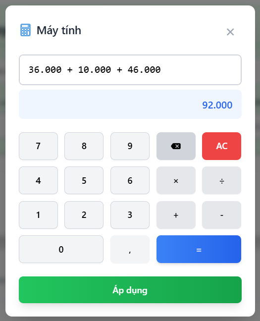 Ô nhập"Giá tiền (VND)": Nhập giá tiền tổng của các món ăn của người hoặc các món ăn đã nhập ở ô "Tên". Bạn có thể sử dụng máy tính để tính tổng giá khi có nhiều món bằng cách nhấn biểu tượng máy tính bên cạnh ô nhập giá tiền, sau đó nhấn "Áp dụng" để áp dụng giá tiền đã tính.