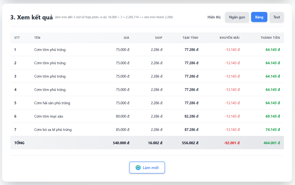 - Bảng: Hiển thị chi tiết theo dạng bảng với đầy đủ thông tin: giá món, phí chia, khuyến mãi chia, tổng tiền